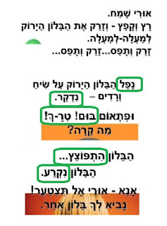 Затем просматривайте картинки, которые я для вас сосканировала из презентации, подготовленной Боазом (בועז) Меором (מאור), и пытайтесь прочитать на них предложения. Если их плохо видно, то читайте ивритские слова и их перевод на русский язык под каждой иллюстрацией.